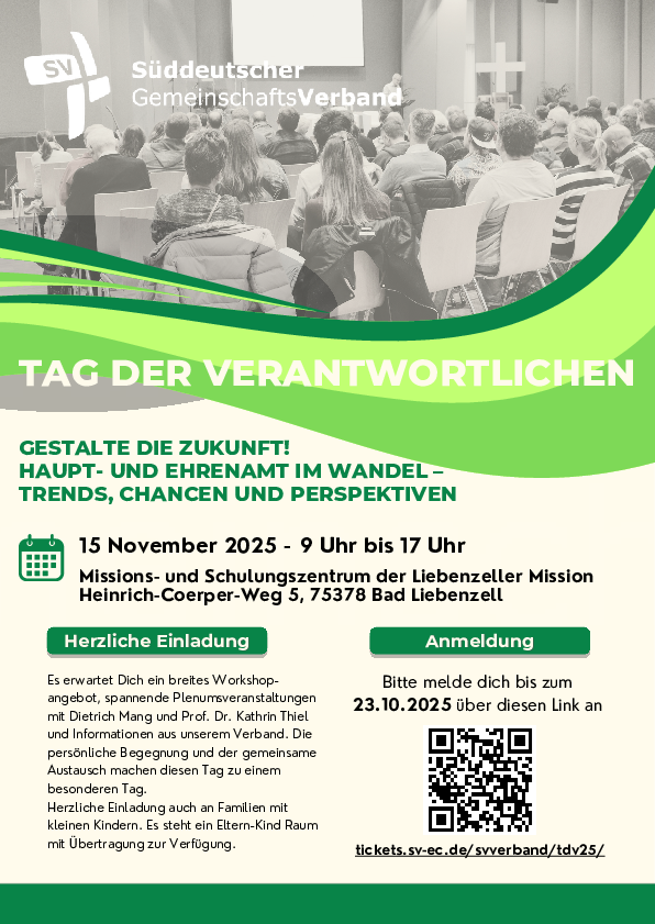 Am Samstag, den 15.11.2025 findet unser Tag der Verantwortlichen im Missions- und Schulungszentrum der Liebenzeller Mission statt. Das Thema lautet GESTALTE DIE ZUKUNFT! HAUPT- UND EHRENAMT IM WANDEL – TRENDS, CHANCEN UND PERSPEKTIVEN