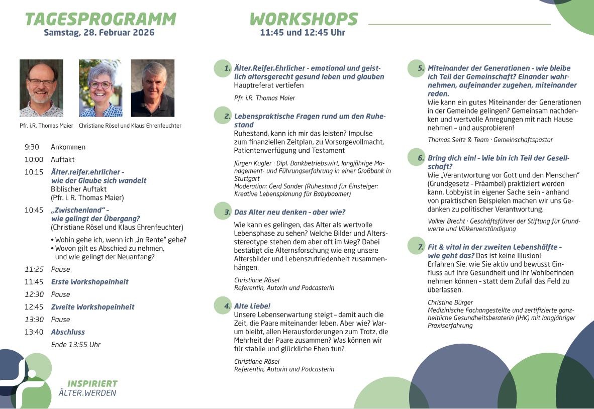 Was bedeutet das für unsere Kirchen und Gemeinden, für unsere Gesellschaft, für das Miteinander der Generationen – aber auch für jeden persönlich? Welche Schritte sind nötig, um diesen Übergang in die neue Lebensphase gut zu bewältigen? Und wie verändert sich der Glaube? Darüber wollen wir miteinander nachdenken mit Impulsen, Workshops und Zeiten der Begegnung. Wir tun das bewusst über Gemeinde- und Verbandsgrenzen hinaus.